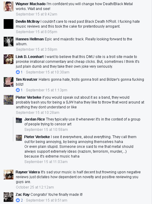 Granted, we all have some guilty pleasures when it comes to music. However, this does not mean that it (metal/music) should stop striving for the upper echelon of compositional greatness. Nor does it mean that we should stop calling out novelty bullshit like Bölzer for faking their way into metal by means of lackluster AOR-riffs payed backwards… MOCK THE IMPOSTORS!