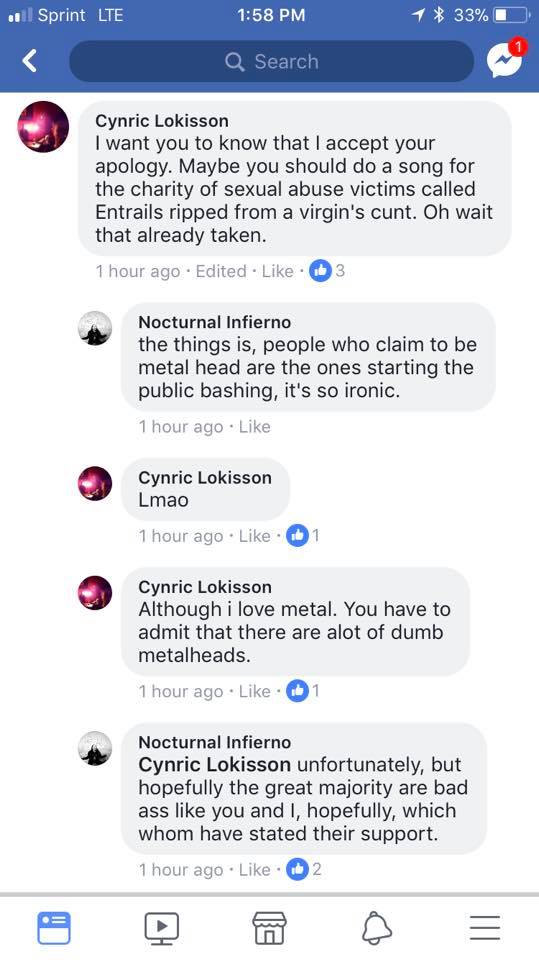 I just want to say that I saw our keyboard player Nocturnal Infiernos post late last night and made a comment and then this morning it had been shared and a lot of people are pissed off and rightly so.